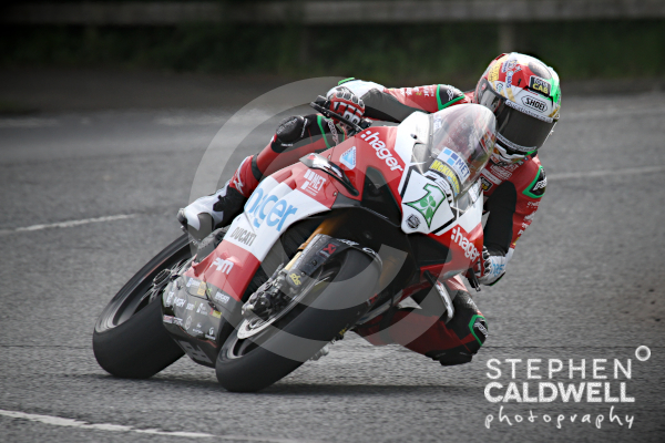 Glenn Irwin through Ballysally (the magic roundabout) on his way to winning his 9th NW200 Superbike Race in a row on the first lap.