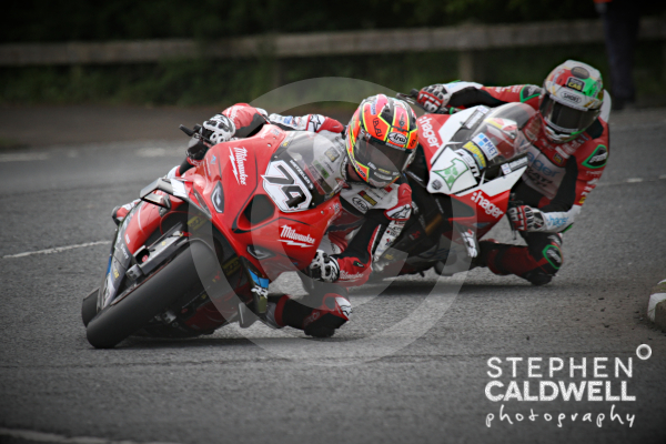 Davey Todd really took the race to Glenn Irwin in the first Superbike Race of the 2024 NW200. This image is of Davey leading Glenn through Ballysally (magic) roundabout on the first lap. Glenn went on to win the race (setting a new lap record on the way) and Davey won the first Superstock Race later in the day.